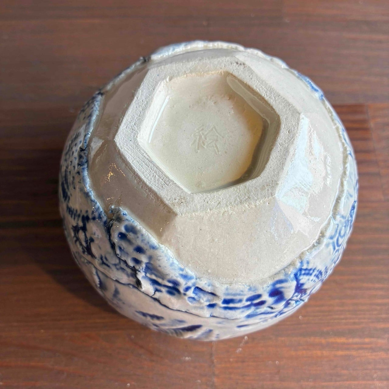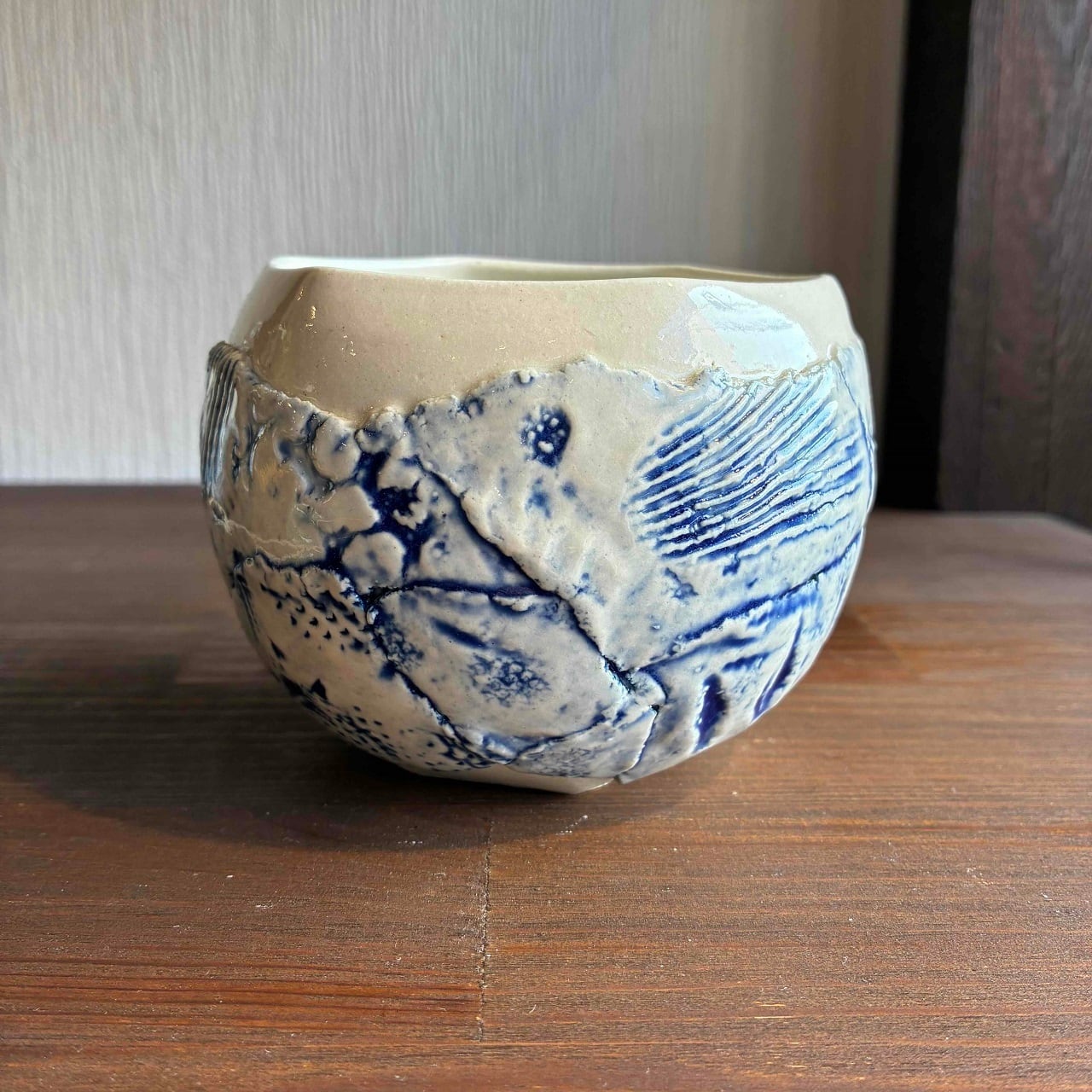 鉢の模様は、一つずつ貝で模様を付けている為、同じ模様がなく、鉢をのぞき込むと綺麗な海の色が。吉田さん作品ならではの鉢です。