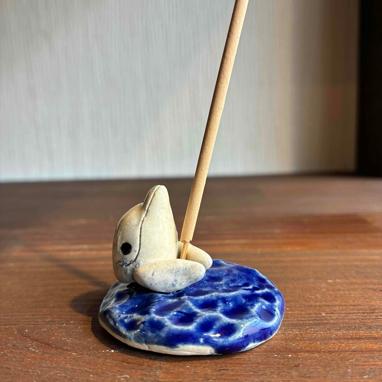 深い海からひょっこり顔を出した可愛いイルカのお香立てです。