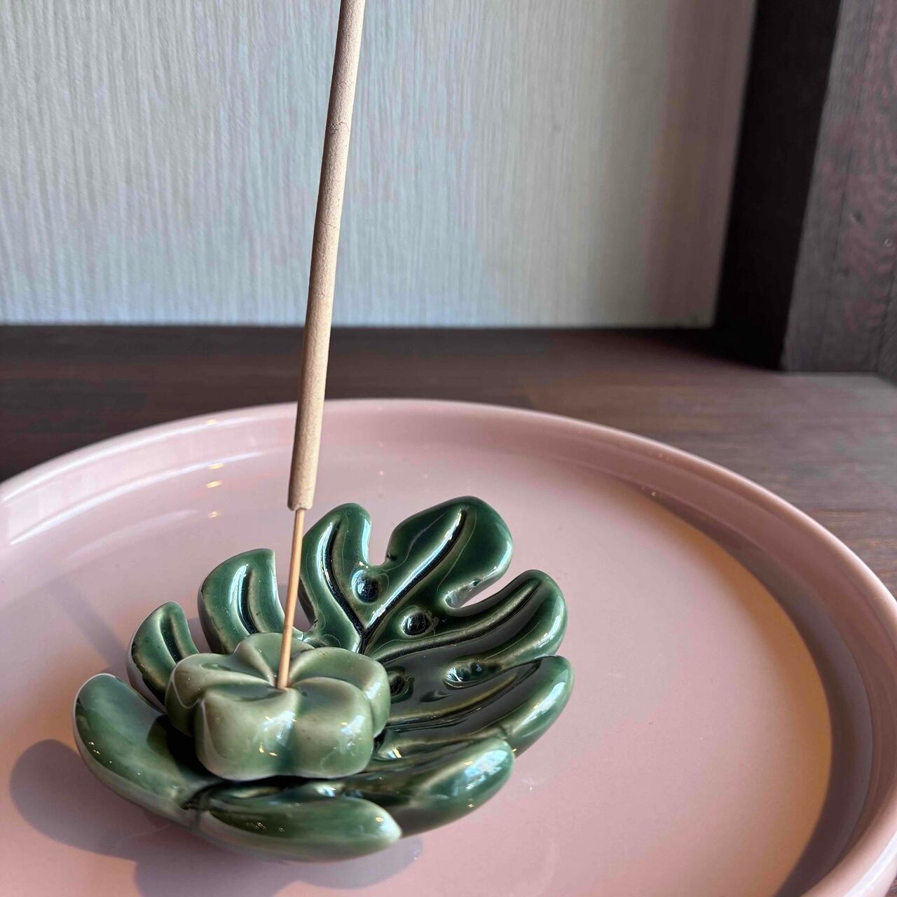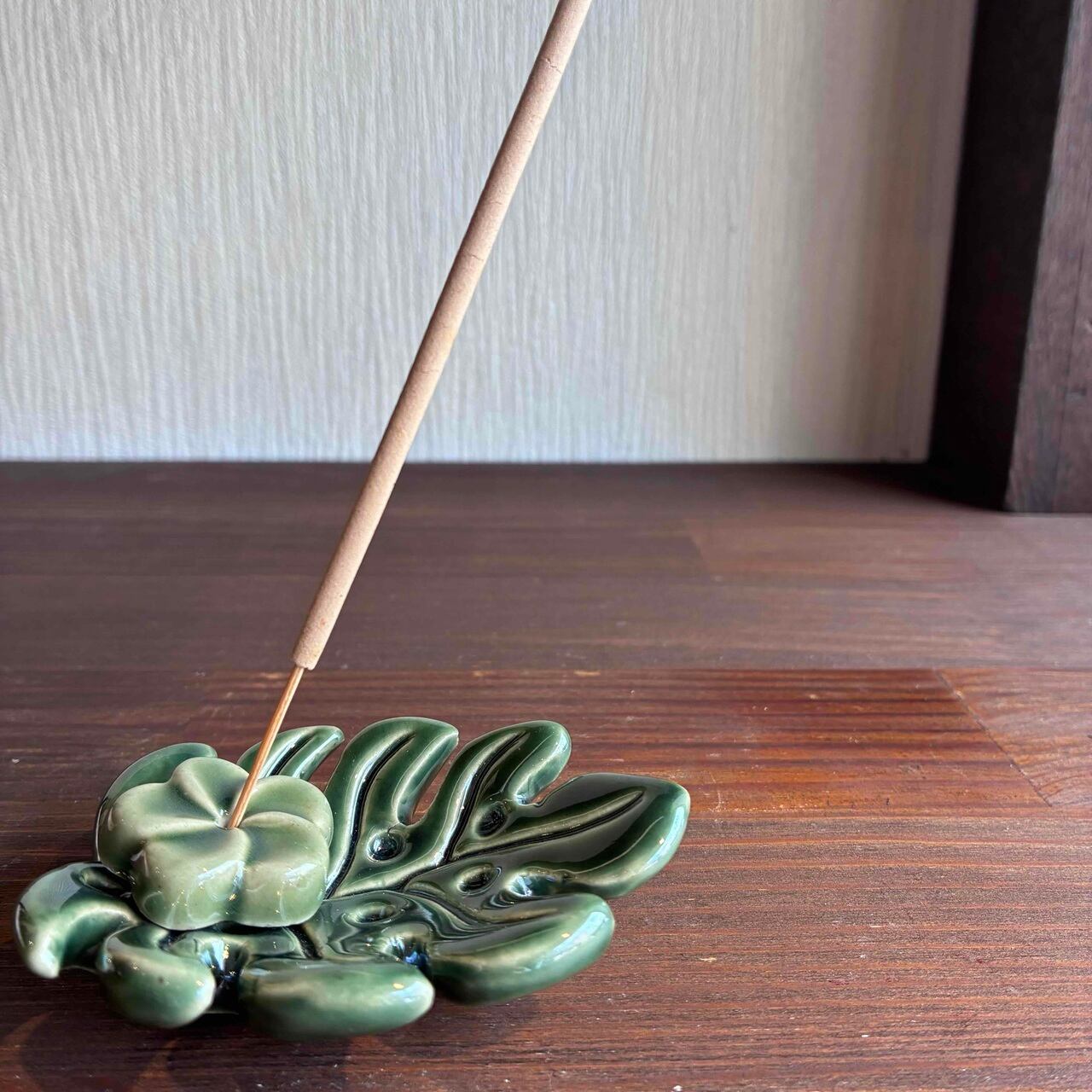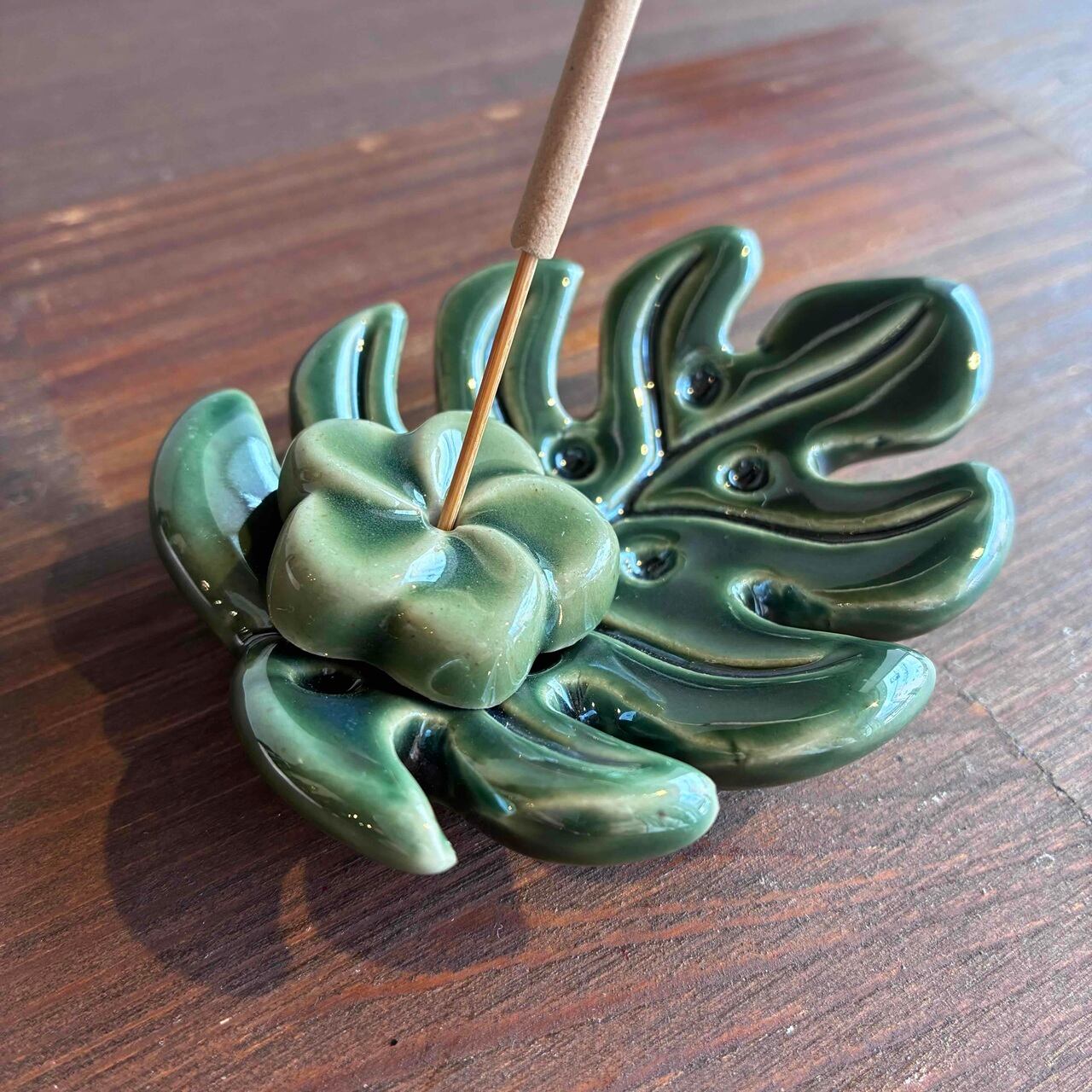 艶やかな深いグリーンのモンステラに、小さなプルメリアの付いたお香立てが入荷しました。