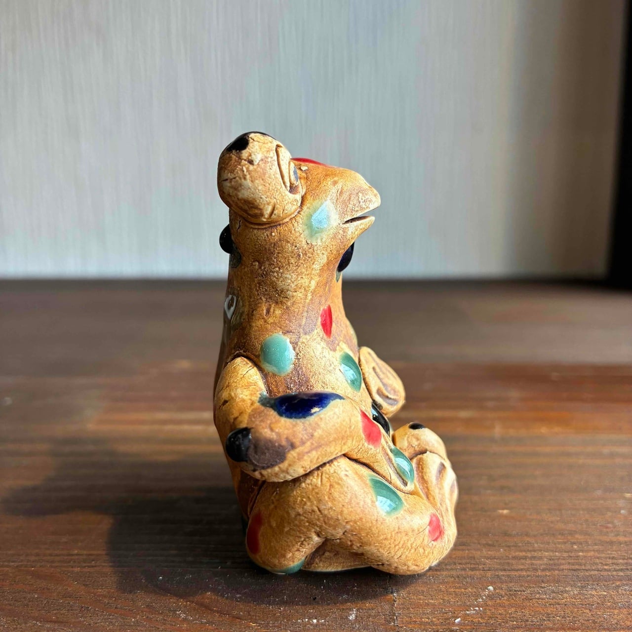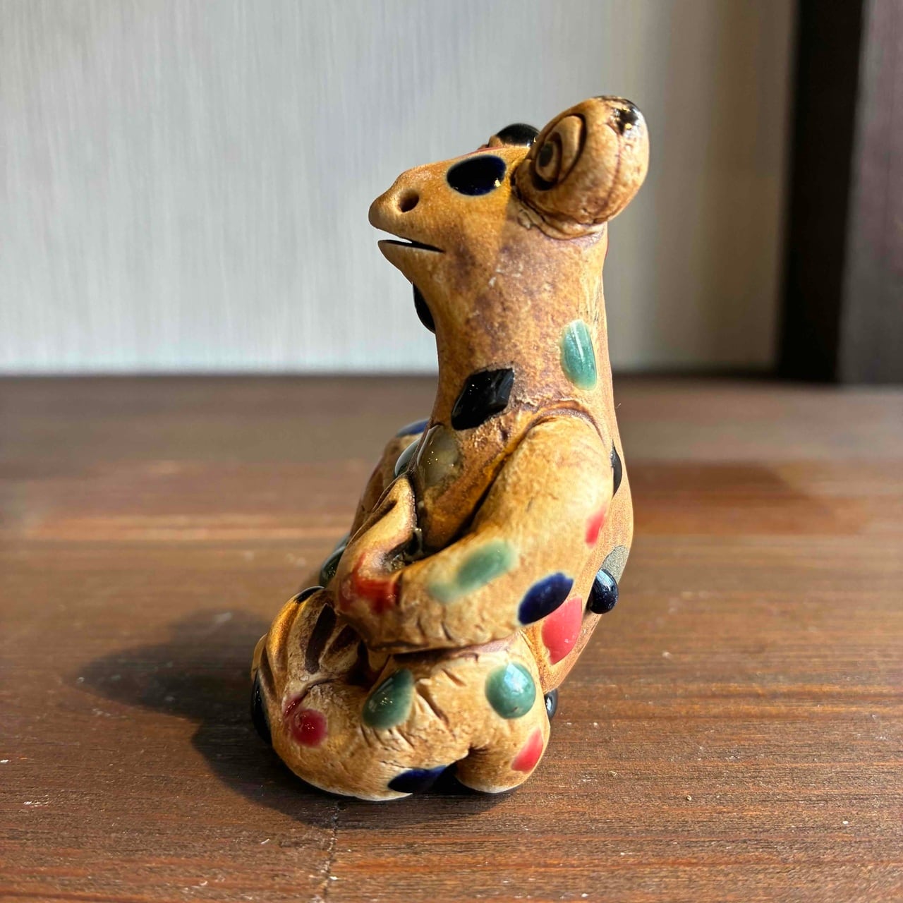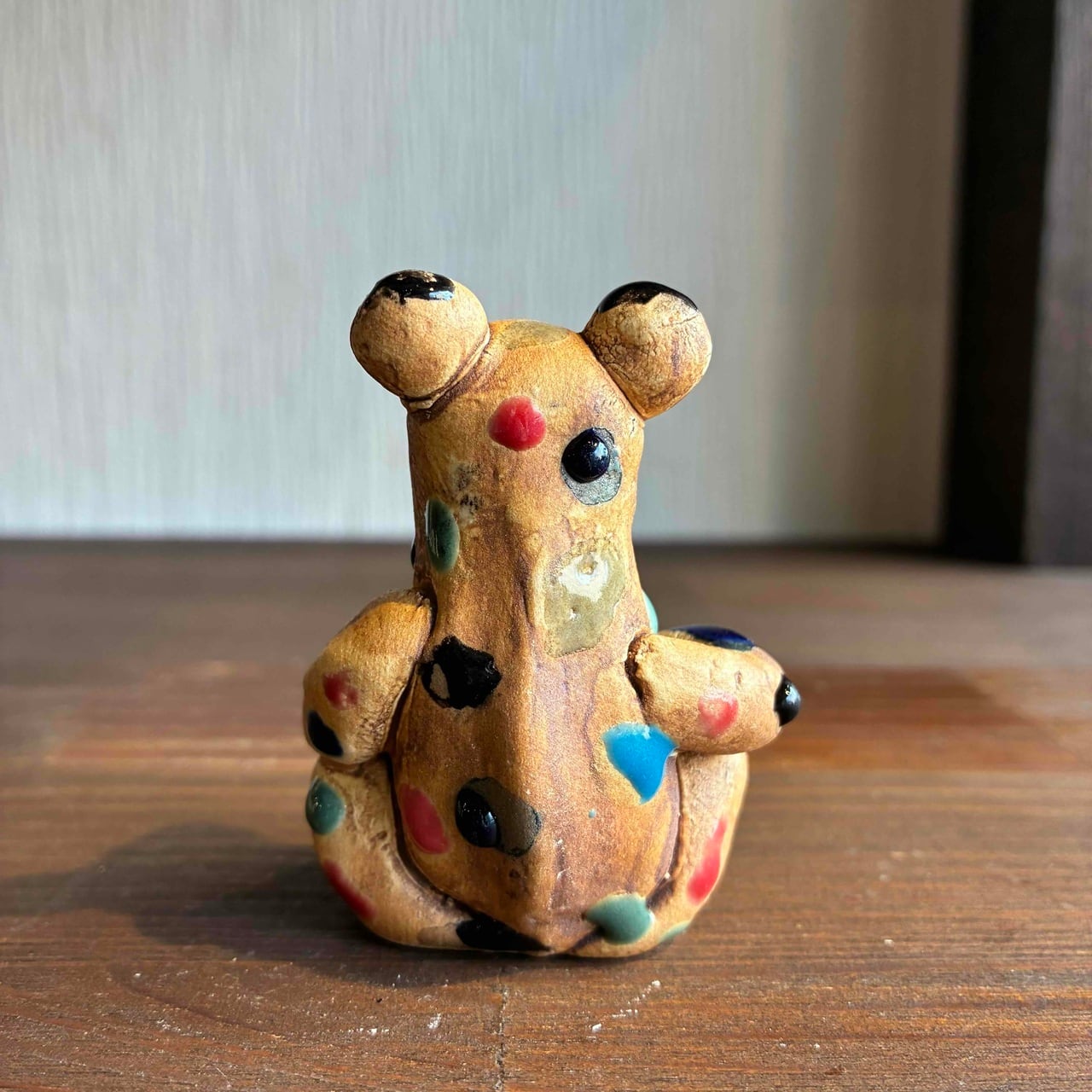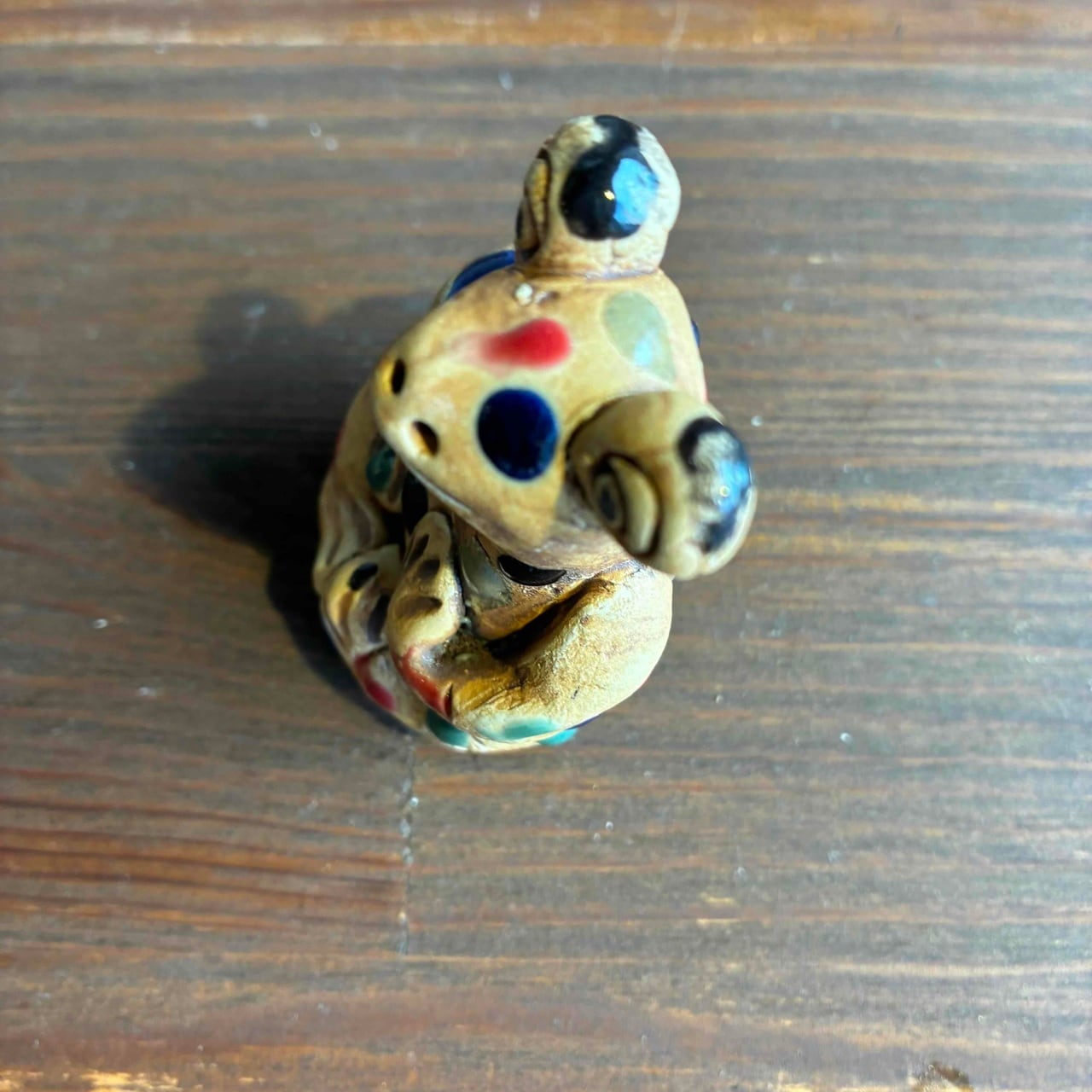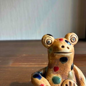 一つずつ手作りされている為、カラフルなドットを纏ったカエルは表情も形、手の位置やサイズも様々で「唯一無二」この言葉がぴったりな、ちょっといると気になる置物です。