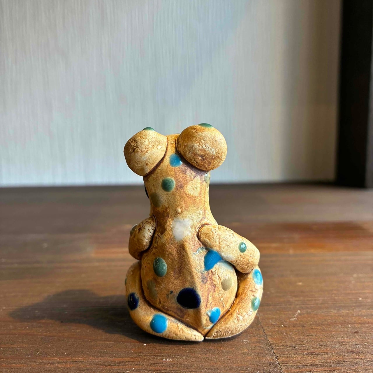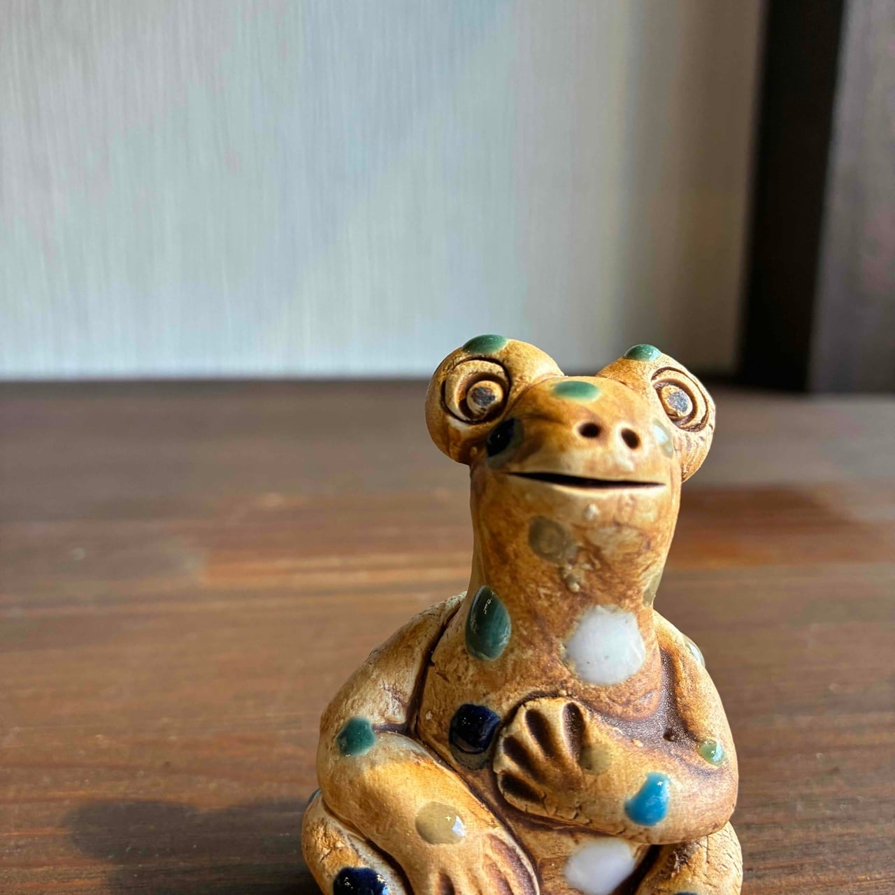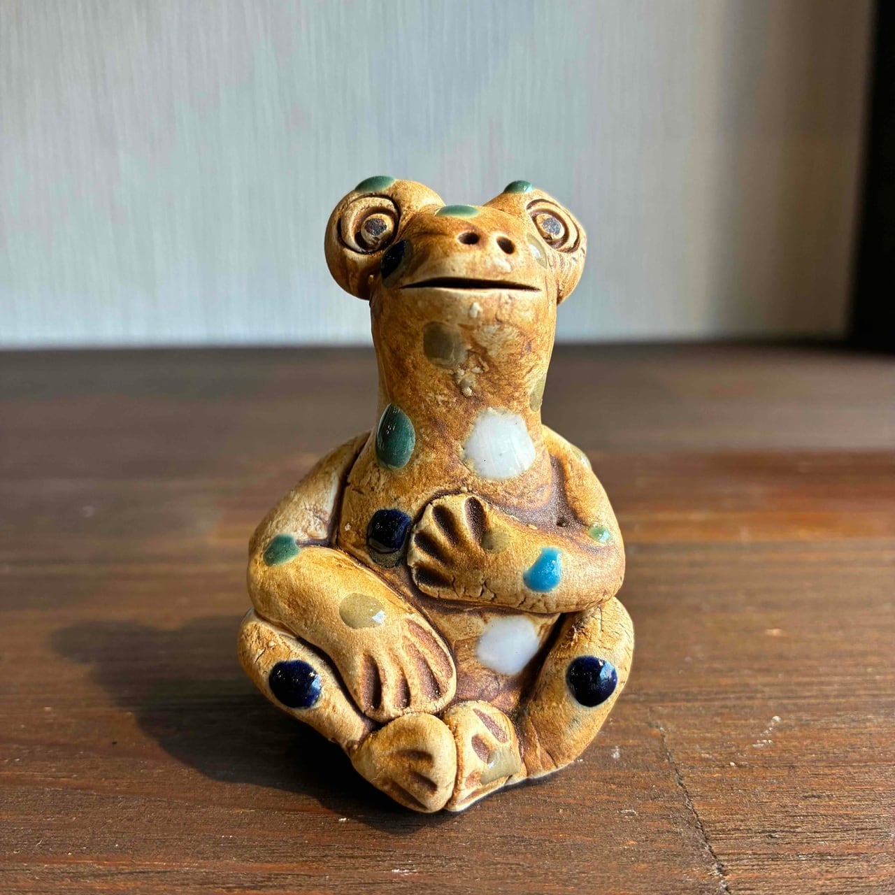 一つずつ手作りされている為、カラフルなドットを纏ったカエルは表情も形、手の位置やサイズも様々で「唯一無二」この言葉がぴったりな、ちょっといると気になる置物です。