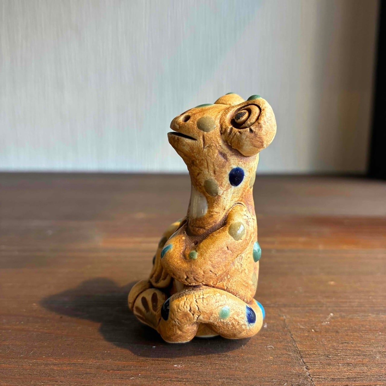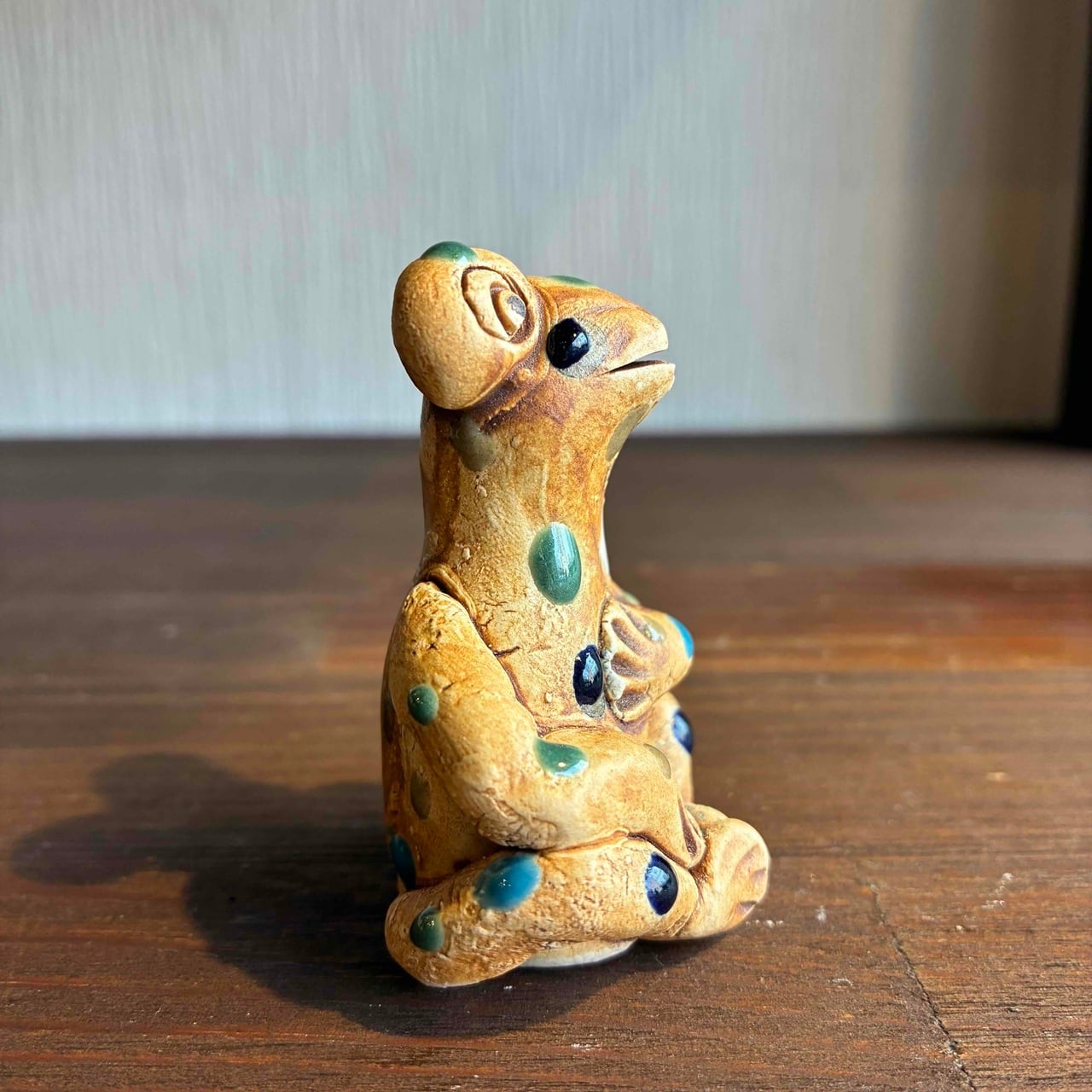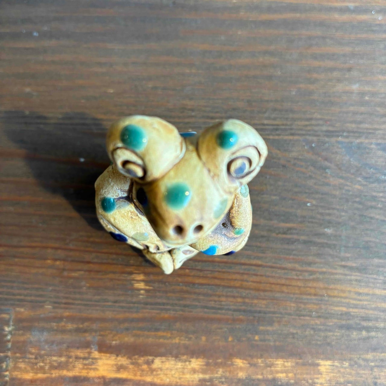 一つずつ手作りされている為、カラフルなドットを纏ったカエルは表情も形、手の位置やサイズも様々で「唯一無二」この言葉がぴったりな、ちょっといると気になる置物です。