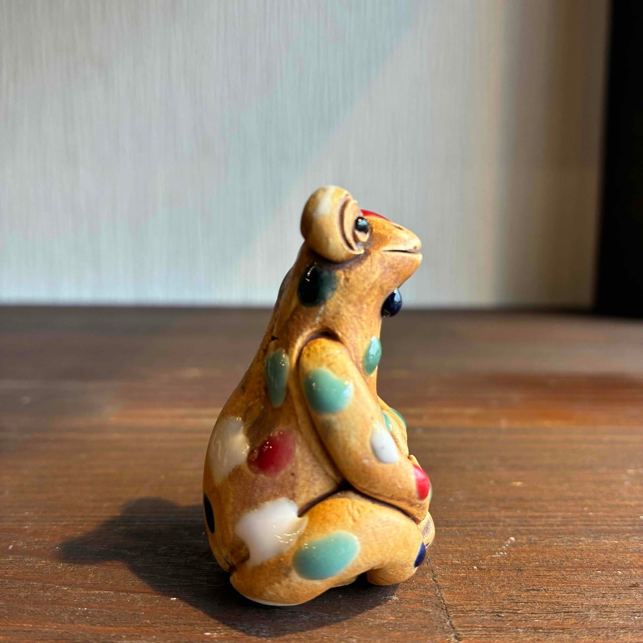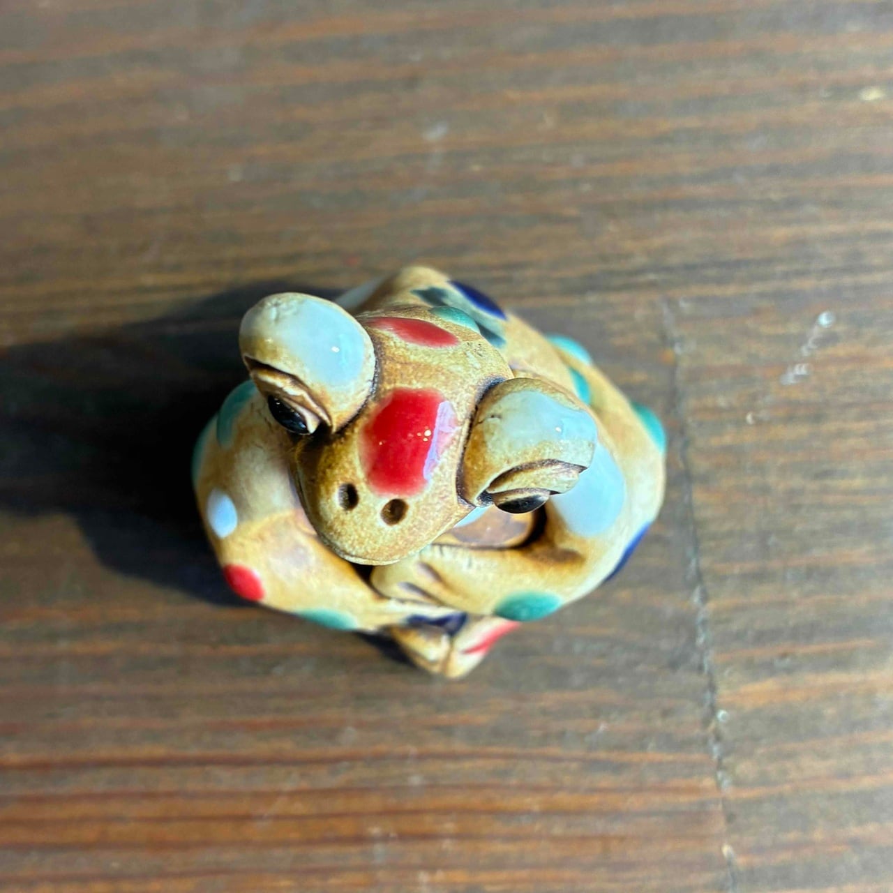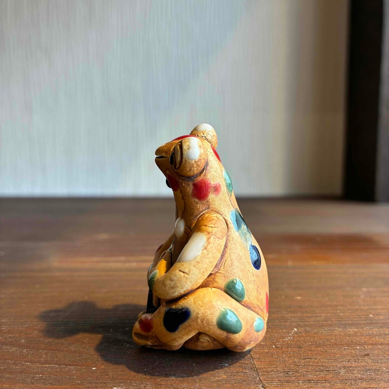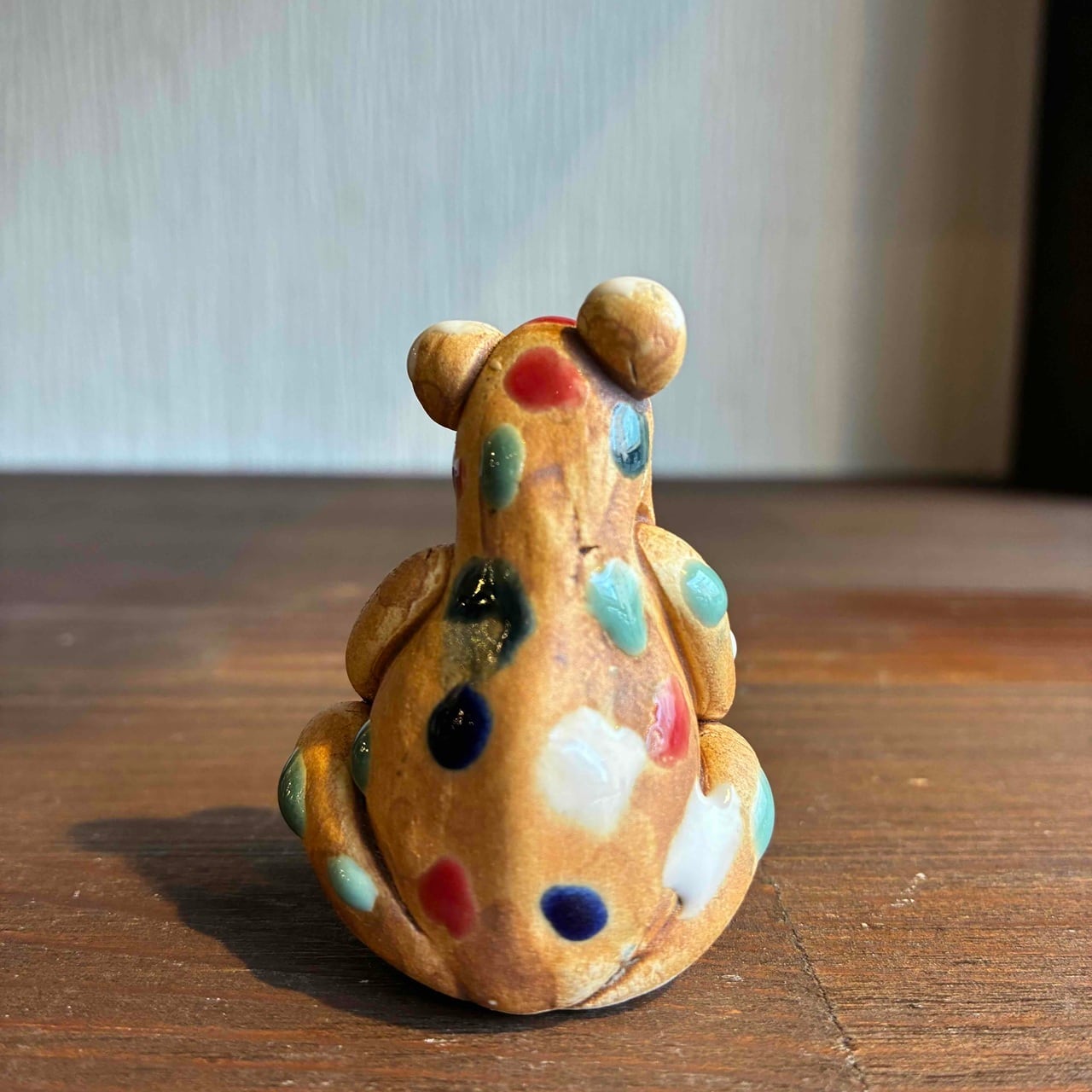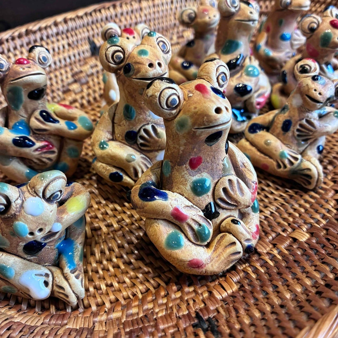 一つずつ手作りされている為、カラフルなドットを纏ったカエルは表情も形、手の位置やサイズも様々で「唯一無二」この言葉がぴったりな、ちょっといると気になる置物です。