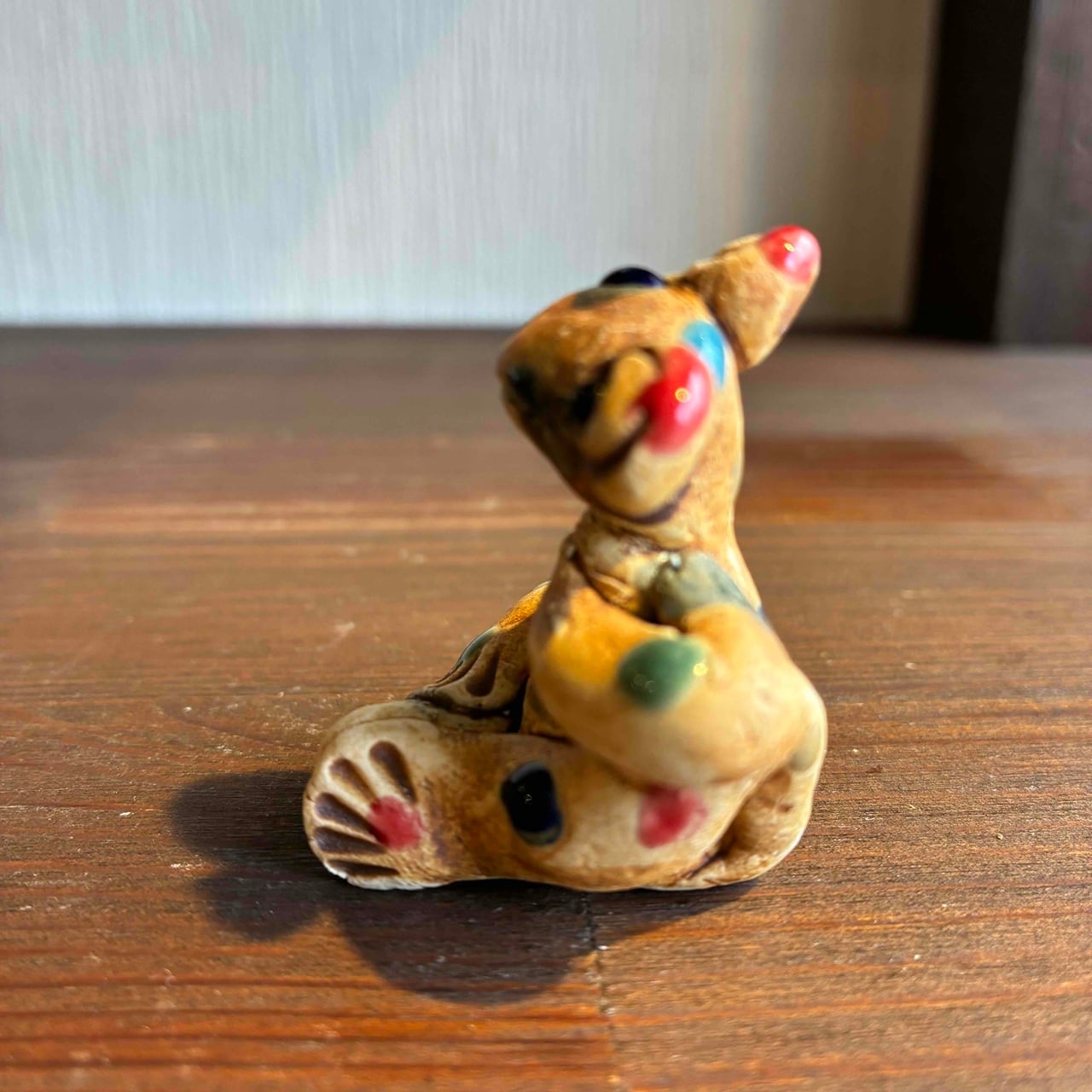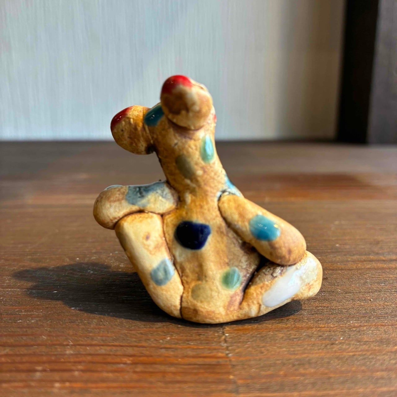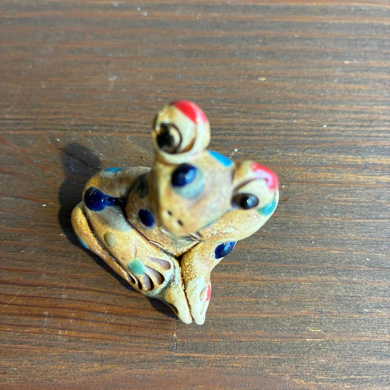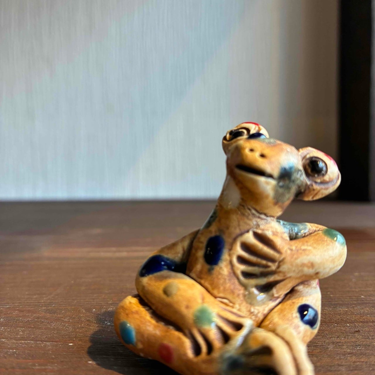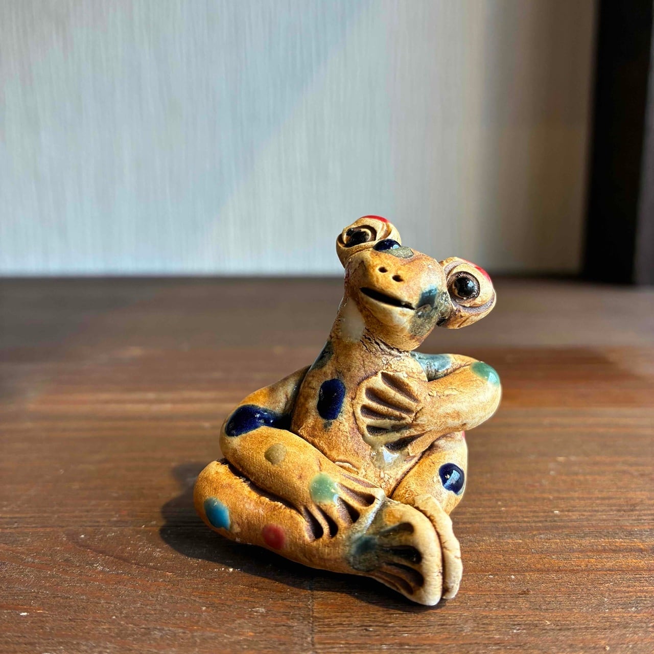 一つずつ手作りされている為、カラフルなドットを纏ったカエルは表情も形、手の位置やサイズも様々で「唯一無二」この言葉がぴったりな、ちょっといると気になる置物です。