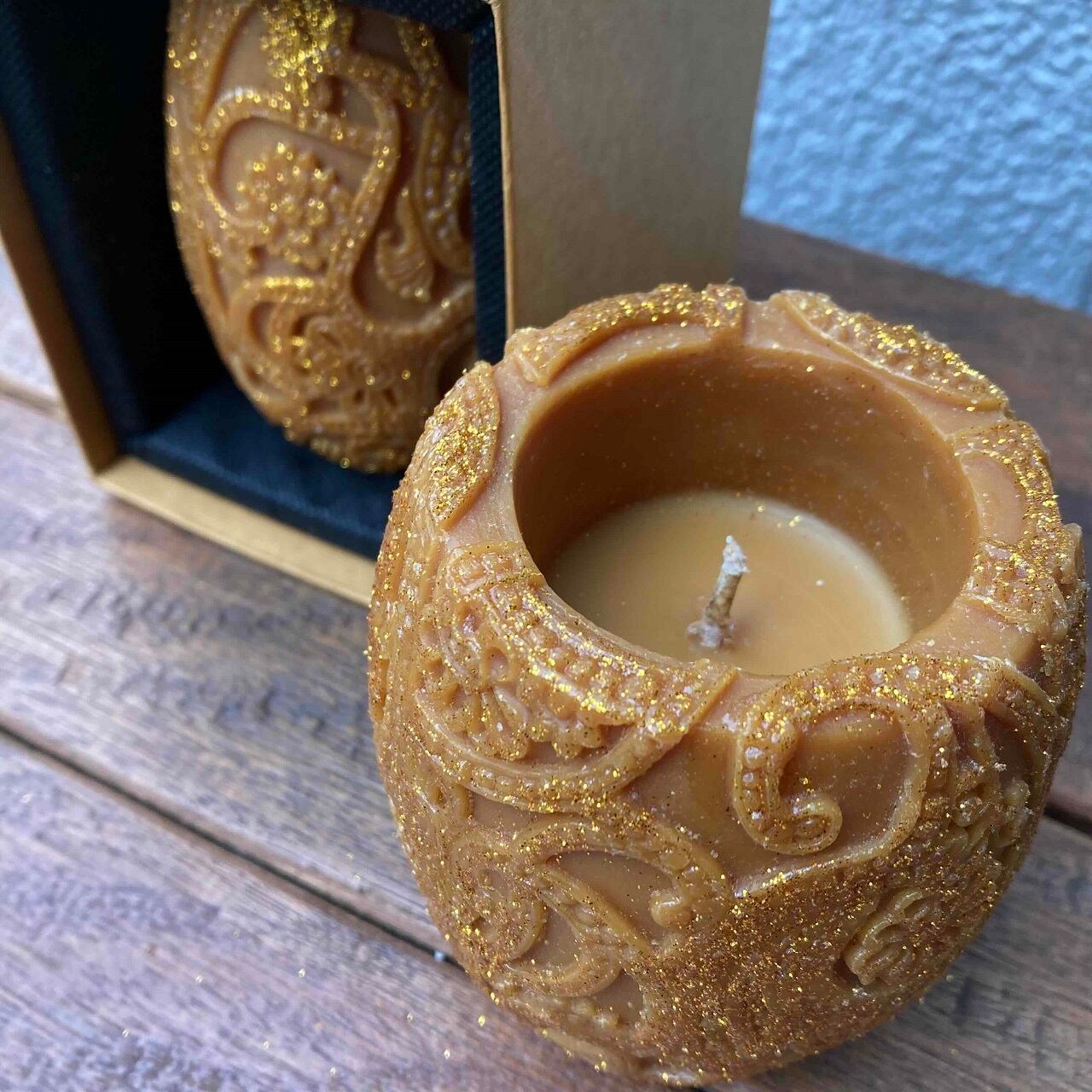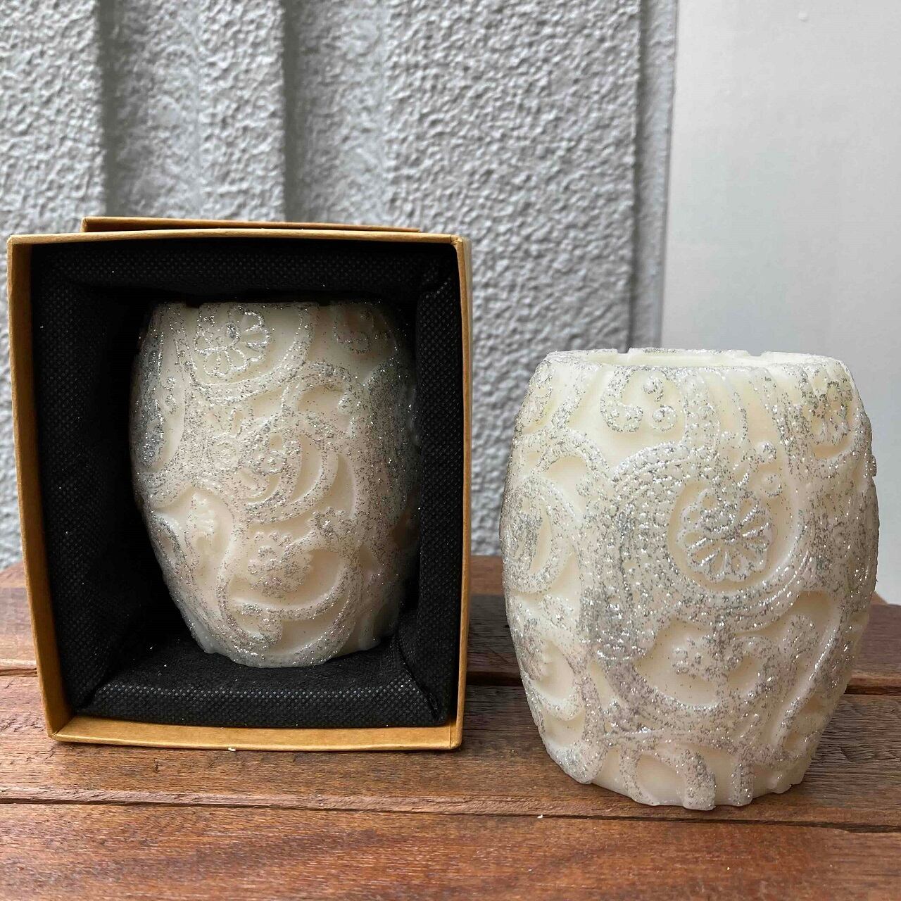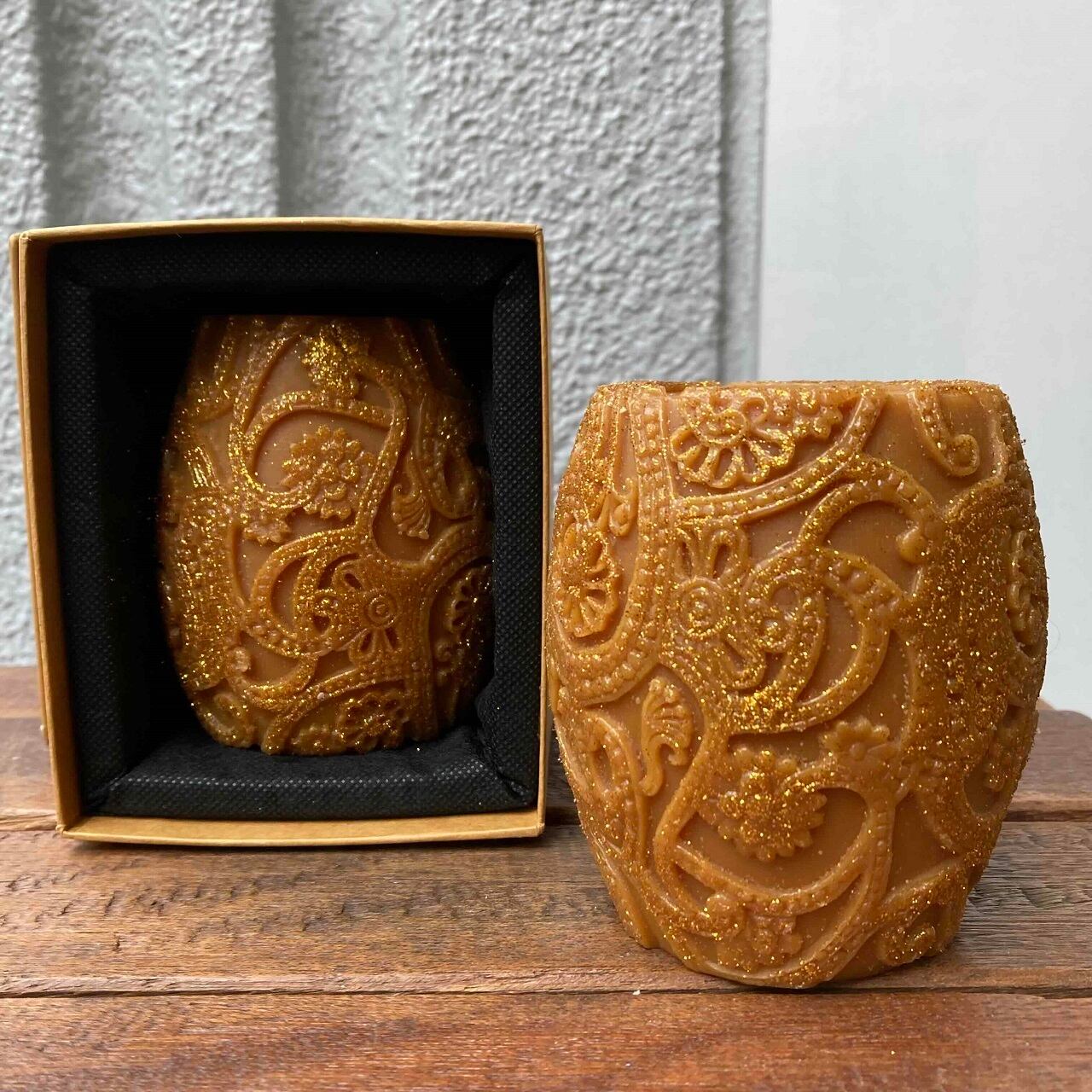 ペイズリーの柄が全体に施され、さらにゴールドのグリッターをコーティングしたオシャレなキャンドル。